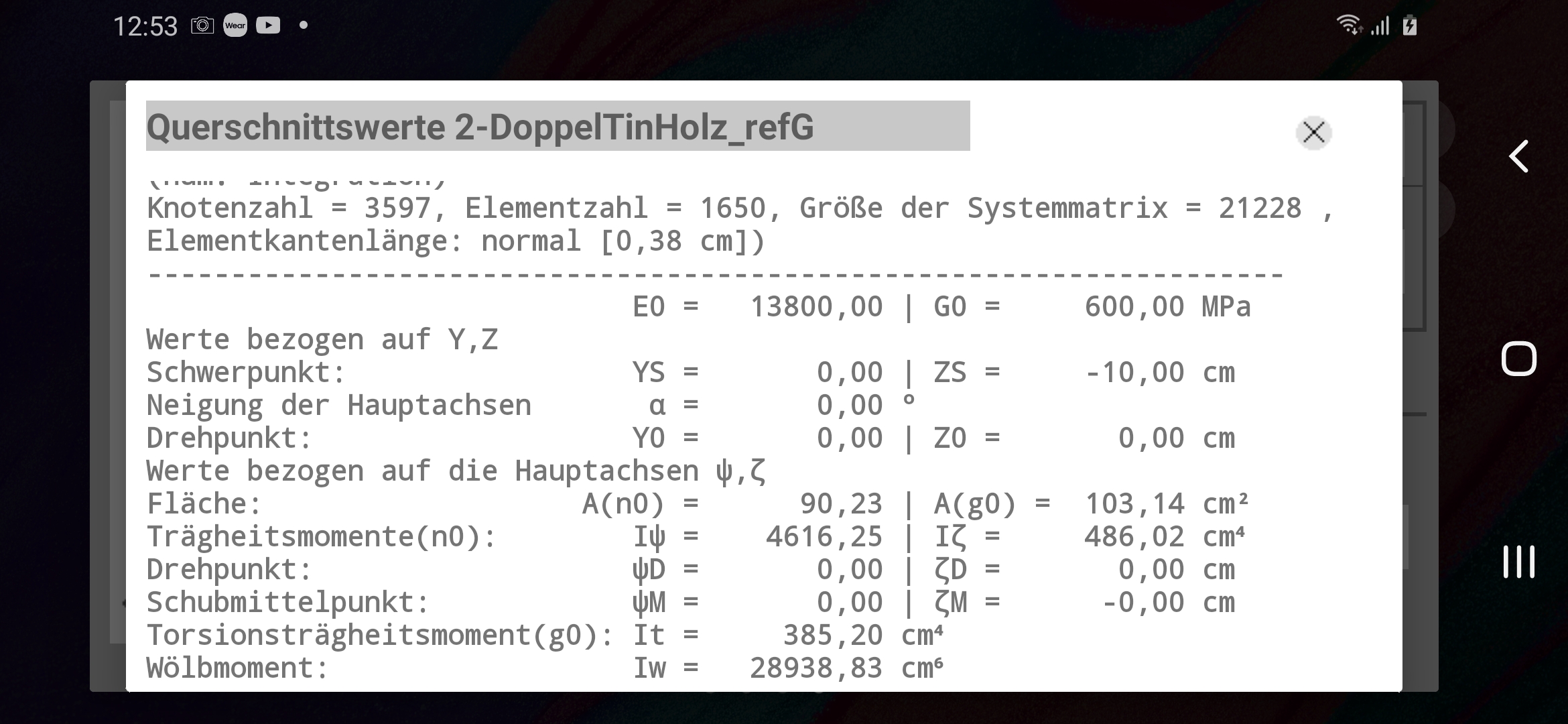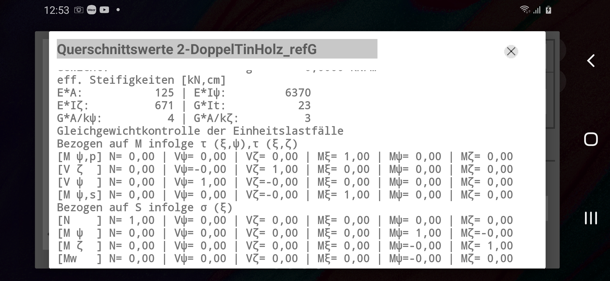 - Ergebnisvorschau für die Querschnittswerte mit Gleichgewichtskontrolle aus Einheitslasten.